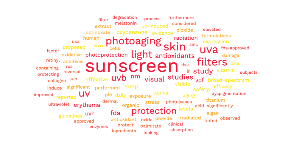 As I finished reading Sunscreens and Photoaging: A Review of Current Literature, I was struct by how much jargon there is in not only this article, but also a lot of articles discussing skincare in general. It makes the decisions we make about what sunscreen is best for us, and the environment extremely difficult. This word cloud is representative of an idea to display all of the jargon, scientific and chemical words that a consumer has to wade through while making this choice. For this representation, I parsed the words from Sunscreens and Photoaging and spent a bit of time deciding a set of words to not include in the image – mostly removing common words that were not specific to sunscreen research. This process itself was pretty interesting. From the perspective of data integrity, this feels like cheating – I was manipulating the data which changed the outcome of the representation which leads into some questions I had with project 1 regarding scientific accuracy within art projects. Maybe this is okay, if the intention and process is clear to the audience?